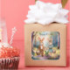 Mother Rabbit: On the right, a slightly smaller rabbit wearing a light blue dress with a darker blue sash around the waist and a small red bow tie. She also carries a basket of Easter eggs. She has a delicate floral crown on her head.
