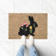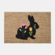 Doormat featuring the silhouette of an Easter bunny with spring flowers in burlap look background . Great at any home for a rustic spring decor . Design by Alma Wad .