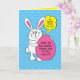 Cartoon illustration of a cute Easter Bunny holding an "eggstra" large Easter egg with a riddle on the egg. The answer is inside along with an "eggstra" special greeting. Copy can be changed.