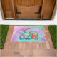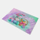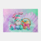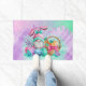 Easter Bunny Gnome with pink bunny ears sitting in spring flowers with decorated eggs and a wicker basket of carrots set on a watercolor teal and purple plaid background with pastel candy icing drips.
