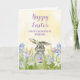 Happy Easter friend greeting card with a cute illustration of an Easter bunny in a spring meadow with watercolor flowers.