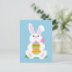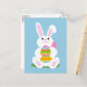 A cute Easter Bunny wearing a pink bow ribbon ever so happy holding on Easter Egg decorated in Spring colours filled with candy sitting on a patch of green grass with a robins egg blue background. Send this postcard to a little or big girl or a family or friend to wish them a Happy Easter.