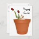 Bunny rabbit peeks out of a flowerpot with tulips to wish a happy Easter photo Easter postcard