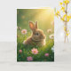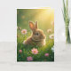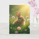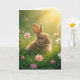 A brown fluffy bunny sits among colourful daisies, bathed in warm sunlight.