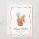 Celebrate Easter with this charming greeting card featuring a whimsical illustration of a bunny resting in a polka-dot flower pot with a carrot and greenery. The soft watercolor design and scalloped edges add a touch of elegance and playfulness, making it perfect for sending warm holiday wishes to family and friends.
