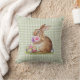 Cute watercolor bunny with flowers and coloured Easter eggs on green and white gingham pattern