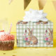 Cute watercolor Easter bunnies with spring flower pot and butterfly on green and white gingham.