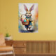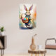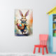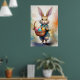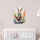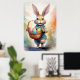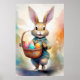 Poster of a cheerful rabbit in a blue outfit carrying a basket filled with colourful, decorated eggs. The background features soft floral details and gentle, warm colours.