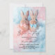 A cute bunny rabbit themed Baby Gender Reveal party invitation. The design features two adorable rabbits in blue and pink bows surrounded by pastel blue and pink smoke. The black typography text reads blue or pink. Personalize the editing the digital or printed invitation with your event details.