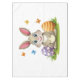 Cartoon smiling Easter bunny sitting between two Easter eggs, butterflies flying around him