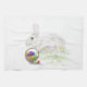 Kitchen towel with an original illustration of a realistic rabbit and colourful basket of Easter eggs.