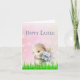 Wish Happy Easter to friends and family with this adorable image of a bunny holding a bunch of flowers. This cute baby rabbit has soft blue and pink flowers and standing on bright green grass. The background is a pale pink. The inside of the card is customizable.
