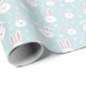 This wrapping paper features a pastel blue Easter bunny pattern with scattered doodle flowers. Perfect for cheerful spring gifting.