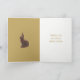 This belated Easter greeting card is shown with an image of a large chocolate Easter bunny. Text in gold-tone on front reads " Did someone say chocolate bunny?" Inside reads "Wishing you one sweet Happy Easter!" Inside left is a gold-colour with same chocolate bunny in a smaller size with eaten-off ears. Text is gold-colour over white.