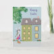 Easter card with bohemian bunny walking along a street scene with colourful buildings, flowers and trees. A card that will make someone smile. Thanks to the hungryjpeg and design cuts for some of the elements in the design.