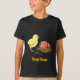 A cute little Easter chick looking at a painted chocolate egg in a nest of chocolate straw.