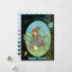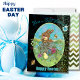 This Pretty Easter Holiday Card features a very cute Eastern Bunny holding a little chick on a dark background surrounded by a meadow with a lot of colourful wildflowers and another chick wandering through and bumblebees flying around.