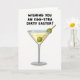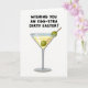 This card shows a sleek beverage glass centered on a bright white background, giving the scene a modern, airy look. Inside the tapered glass, a pale golden drink catches the light with a gentle shimmer, like a quiet toast shared between close friends. A thin wooden skewer holds two round green fruits, one dipping into the drink while the other leans on the rim as if nudging the glass with a flirty little wink 🐇. Above the glass, the message “WISHING YOU AN EGG-STRA DIRTY EASTER!” sits near the top in thick, hand-drawn lettering that feels casual and cheeky. The text is in dark ink for strong contrast, standing out clearly against the white space and keeping the focus on the joke. The simple layout leaves plenty of breathing room, balancing the refined drink image with a mischievous Easter twist 🌷. The green fruits look glossy and plump, with the skewer angled slightly to the right across the rim.