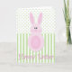 This card features a cute little bunny who is also part Easter egg! A fun design on a green polka dot and striped background. Curly text below reads "Happy Easter."