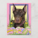 This Doberman Dog is surrounded by Easter Egg decorated Cookies and looking forward to helping you send Easter Greetings and to welcome in Spring. This design is available in over 70+ Dog Breeds. If you don't see your favourite Dog Breed OR if you would like YOUR OWN DOG in this design, just contact me. There is also a version of this design that you can upload your own photo into.