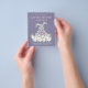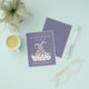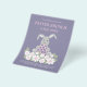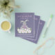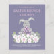 Cute Easter Bunny egg hunt and brunch budget invitation with an adorable spring bunny rabbit holding a pink and purple spotted Easter egg surrounded by daisy floral and eucalyptus foliage on a purple background. Handwriting typography script templates in pink and white for all the details of your fun spring party. Original artwork by artist Catherine Sweetman