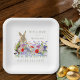 Easter egg hunt personalised family name welcome paper plate with cute Easter bunny and colourful watercolor wildflower meadow. Ideal for spring garden party and Easter brunch and egg hunt boxes. Sage green handwriting typography script with easy to use templates so you can add a family name. Simple modern minimalist design perfect for a spring garden party Easter egg hunt. Original artwork by artist Catherine Sweetman