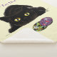 A cute black cat is about to pounce on some Ukrainian Easter eggs in a backdrop of yellow