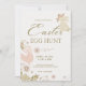 Cute Easter egg hunt invitation with cute bunnies, and spring flowers frame on a white background. Customisable typography.