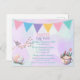 The cutest Easter Egg Hunt invitation postcard with a bird on a branch looking down on some Easter eggs and a cup of eggs and flowers on the side. A colourful banner flag makes the picture complete.