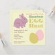 An Easter egg hunt invitation featuring an illustration of a purple bunny at top left and pink and yellow Easter eggs at bottom right. Personalise the text with details of your occasion.