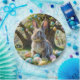 A cute bunny sits surrounded by colourful, decorated eggs under a tree with hanging eggs