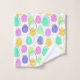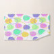 This towel set has a Easter design of eggs in purple, yellow, green, blue, and pink scattered about with their outlines.