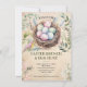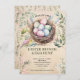 Colourful Easter eggs are displayed in a bird's nest among green leaves to welcome the springtime holiday. A small pink and yellow bird sits on a leaf nearby wondering how those eggs got in the nest. The background is a watercolor textured cream while leafy branches surround the nest. Perfect for your Easter brunch or luncheon, or a family and friends Easter egg hunt. Available with matching products.