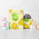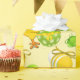 Cute baby Easter chicken cartoon with blue eyes, holding a light green Easter egg with little flowers, yellow ribbon and beautiful shiny Easter eggs in yellow and green pattern.