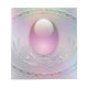 A pastel blue, lavender, and pink design with a translucent pink egg in a silver filigree setting, circled by a light silver oval frame set with four more smooth gems like colourful eggs.