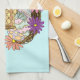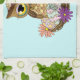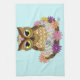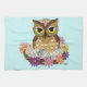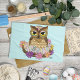 Cute brown Easter owl sitting in a nest of pastel easter eggs and flowers in a backdrop of bright blue
