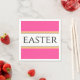This fun, classy design features EASTER text inside a wide white centre stripe highlighted with black, yellow, and orange racing stripes against a bright pink background. The text can be personalised.