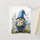 Send a touch of Easter magic with this charming watercolor postcard, featuring a whimsical gnome dressed in a soft blue outfit, complete with a tall, floppy hat that adds to his playful charm. With a joyful expression, he holds a woven Easter basket brimming with colourful, decorated eggs, ready to spread festive cheer.