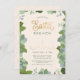 This customisable Easter Brunch (or any type of Easter gathering) invitation features an illustrated border of green, grey and blue flowers with a cream colour background (that can be changed to your liking). The text "Easter" is in a gold, modern script font. A gold cross is included in the design, but can be removed upon further customisation if you wish. The event details can be customised for your special gathering. The back side is a matching cream colour (also changeable) with an overlaying gold quatrefoil pattern.