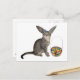 Kitten with rabbit ears sits by a basket of coloured Easter eggs. Spring postcard.