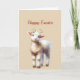 The image features an adorable white lamb with a soft, fluffy coat, standing gracefully. The lamb has a gentle, serene expression with bright eyes and perked ears. A golden halo floats above its head, symbolising purity and divinity. A small floral arrangement, including white blossoms and green leaves, adorns one side of its head, enhancing the peaceful and sacred feel.