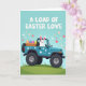 This card shows a teal open-top utility vehicle climbing a gentle green hill, dotted with small white heart decals that hint at a sweet delivery. A long-eared white bunny with rosy cheeks sits at the wheel, looking ahead with a bright, friendly focus 🐰. In the back, a wooden crate holds four decorated oval eggs painted in spring shades like pink, blue, purple, and yellow, each with its own tidy patterns. The scene feels like a caring gesture in motion, as if the driver is bringing something special to a friend just over the rise. Across the top, the phrase “A LOAD OF EASTER LOVE” appears in large white letters, centered and easy to read against the sky. Behind everything, the background fades from deeper blue to pale pastel tones, giving the day a soft, airy look 🌷. A scatter of heart shapes in pink, peach, and white drifts around the vehicle, some small and some larger, like confetti falling through the open air. The bunny’s ears tilt back slightly as the big tires roll upward, with hearts floating across the blue gradient sky.
