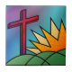A stained-glass design illustrating Easter morning, with a red cross standing on green hills beside a fiery sunrise.