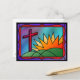 A stained-glass design illustrating Easter morning, with a red cross standing on green hills beside a fiery sunrise.