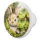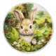 A cute rabbit peeks out from lush greenery, surrounded by vibrant flowers in a picturesque garden. In the background, an old stone tower stands amidst rolling hills under a bright blue sky. Digital Art