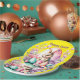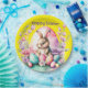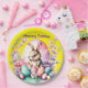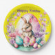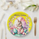 Cheerful yellow Easter plate with a rabbit and eggs for your Holiday