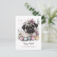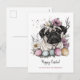 Cute pug Easter botanicals postcard. Rustic watercolors and lineart style pastel colour pug with Easter eggs and floral botanicals. Personalised text with a lovely trendy script.
