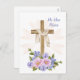 Easter Christian Holiday Card. Empty cross "He Has Risen" with flowers.