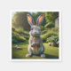 A winking grey rabbit is sitting in a lush garden holding a carrot.