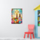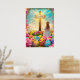 He is risen. Holy Easter Poster with a cross, vibrant easter eggs and floral art. Holy Jesus Christ religious christianity art.